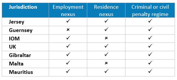 5.1.3 We have discounted what may be thought of as a fourth option which is the removal of both the residency and employment nexus. The primary reason for this is the difficulties that we, and other agencies, faced to enforce criminal and civil penalties against individuals who have contravened the law and have no connection to Jersey. This is of course particularly relevant for the MLRO role which is subject to both criminal and civil penalty regimes.