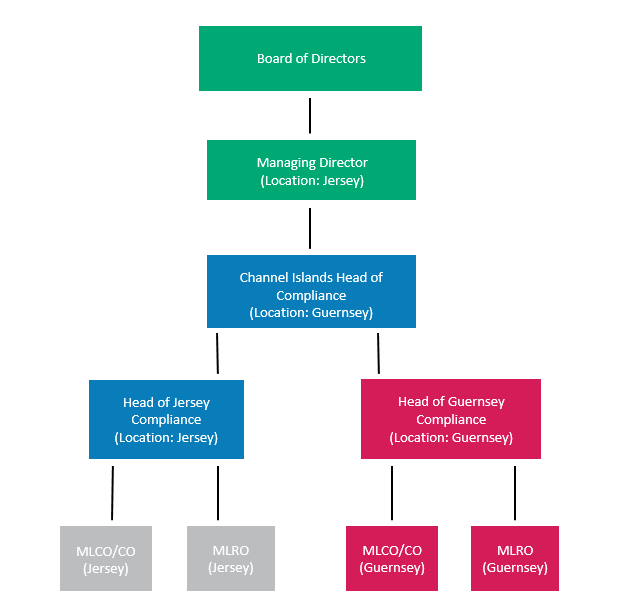 Where the registered person is not a company “board” should be read to mean the equivalent governing body of the entity. Where the registered person is the Jersey branch of an overseas incorporated bank the reference to “below board level” should be substituted by a reference to “below the level of the senior officer required by Article 11(2)(a) of the Banking Business (General Provisions) (Jersey) Order 2002, as amended”. |