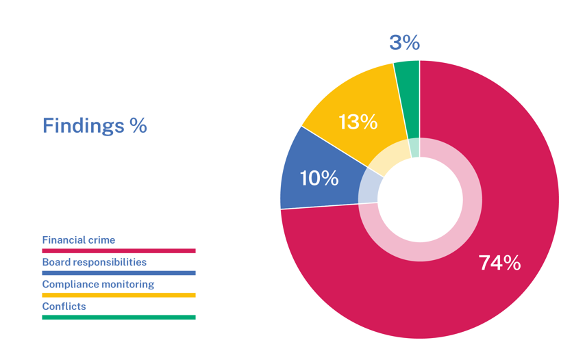 Approximately 73% of the findings related to non-compliance or partial compliance with the statutory and AML/CFT code requirements. The remaining findings related to board responsibilities, compliance monitoring and conflict of interests.