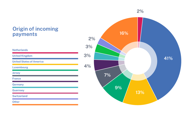 At the time of the review, our Supervisory Risk Data indicated that during 2019, Jersey’s banks received over 2.2million inbound wire transfers totalling £385bn, of which 78% by value were from Europe and the UK and a further 14% from North America. Jersey’s banks made over 2.4m outbound wire transfers totalling £365bn, with 69% by value made to Europe and UK and a further 22% to North America.