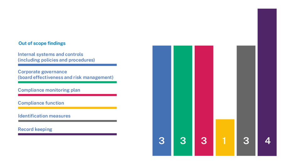 Other key areas of cross over included policies and procedures, record keeping and identification measures and client due diligence including source of funds and source of wealth. The related feedback paper lists 19 finding areas.