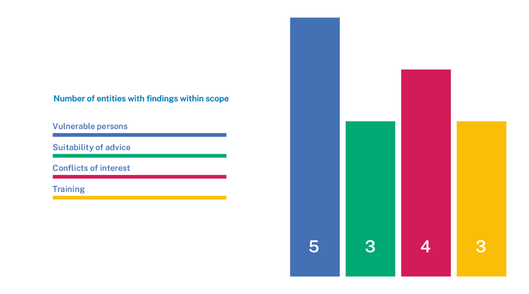 Nevertheless, there were similarities across both examinations (noted in section 1.3), indicating that certain areas of weakness in the sector remain. The relevant areas to the vulnerable person examination were the 2017 findings relating to suitability letters, vulnerable clients and conflicts of interests.