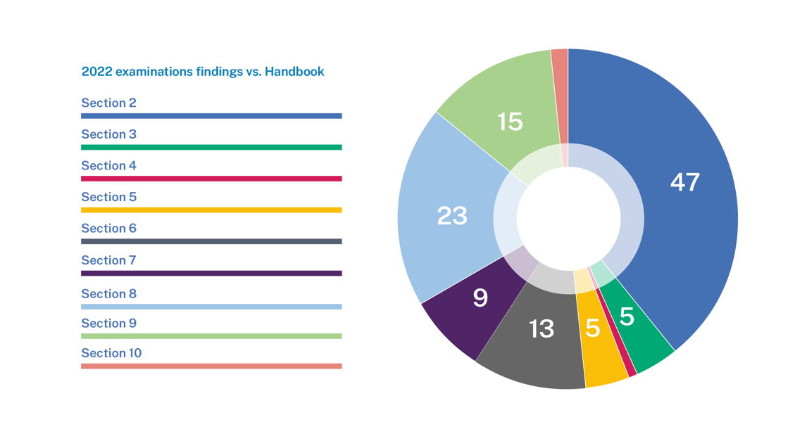 Of the 120 financial crime examination findings for 2022, 98% fall into four main themes. The percentage of total findings in each theme remains relatively consistent with 2020 and 2021.
