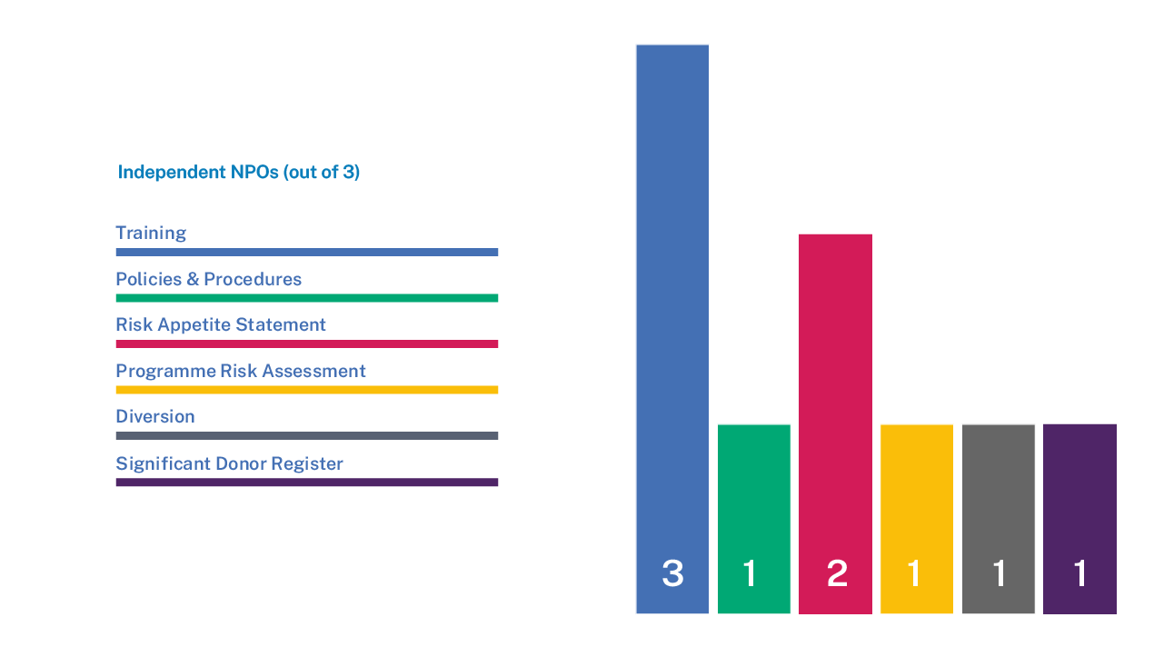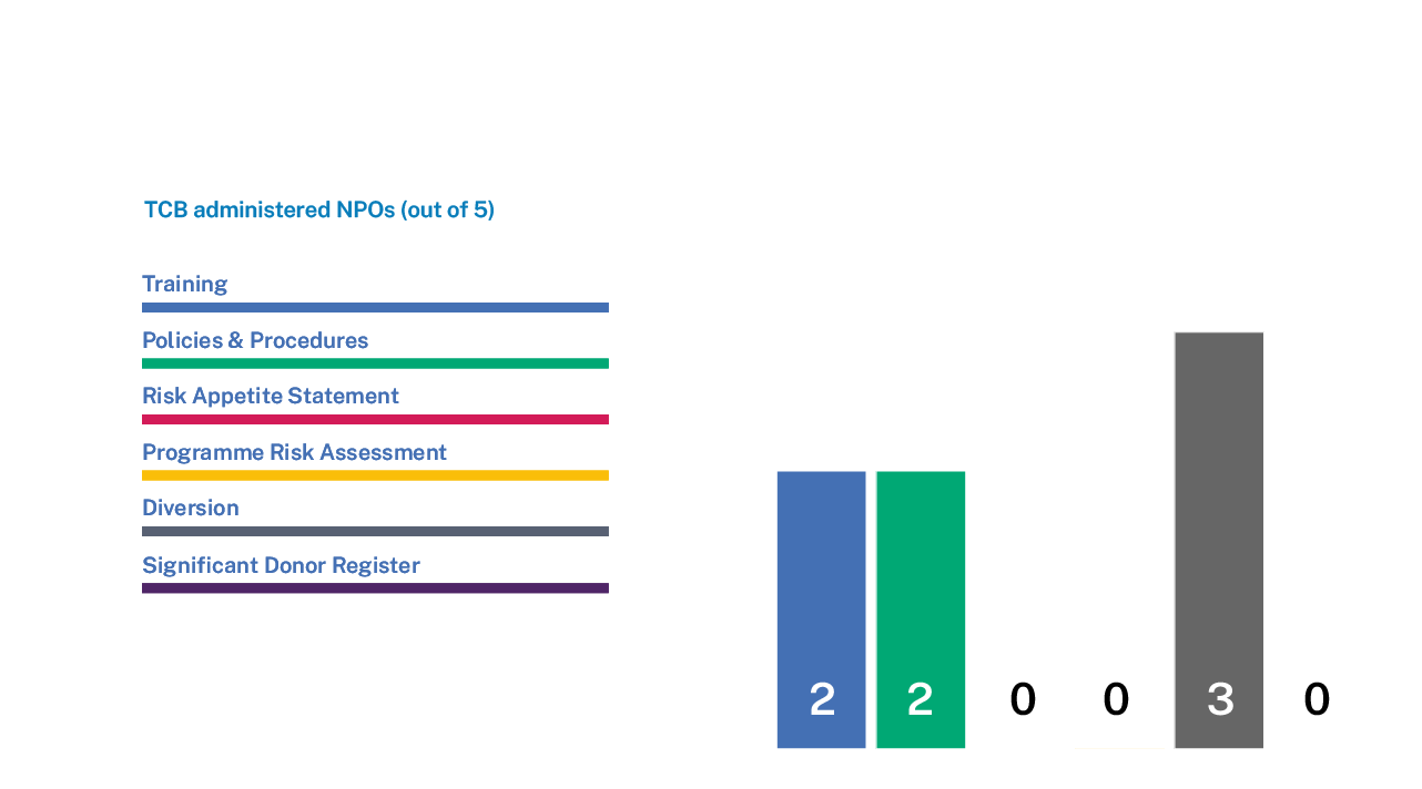 Two Prescribed NPOs had an Associate NPO as the recipient of donations, but insufficient information was held on where and/or how the funds were being used after this point. Two further NPOs were able to evidence that the risk of Diversion had been understood and considered by the Boards/Governors, but processes were currently being enhanced further to fully evidence funds reaching their ultimate beneficiary.