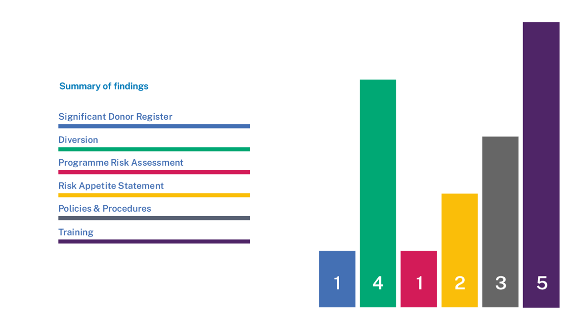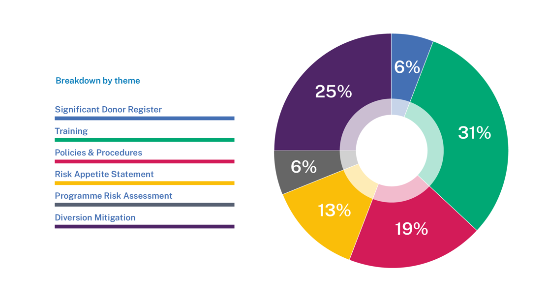 Diversion risk – 75% of Prescribed NPOs examined were able to fully demonstrate that diversion risk had been appropriately considered, mitigated and documented. Of the remaining 25% the prescribed NPOs were able to demonstrate consideration had been given to diversion risk but they were not able to demonstrate they had recorded/evidenced that all funds had been received and used in their entirety in line with their intended purpose.