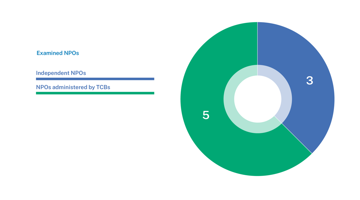 The selection process of who would partake in the thematic examination was supported by our risk model, information submitted by firms and our supervisory knowledge. The eight examined Prescribed NPOs break down as follows: