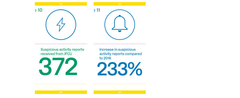 In 2019, we received and successfully processed 372 SARs from the JFCU, up from 160 in 2018. We attribute this increase primarily to the revamped triage process we now have with the police and this reporting can only put our Supervision and Enforcement teams in a more informed position.