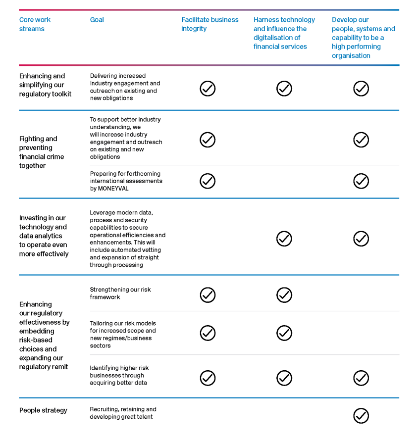 An effective regulatory framework is also essential for protecting Jersey’s status as a competitive, well regulated International Financial Centre. It strengthens Jersey’s attractiveness to well run businesses. A key aspect of this is ensuring that we support Industry in their understanding of, and adherence to, the evolving requirements of International Standards Setters such as FATF. To do this we will be: