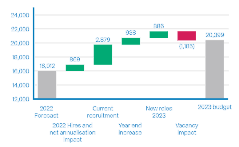 The employee costs below illustrates the key drivers for the overall cost increase. The Current Recruitment column includes open recruitment roles and those under offer or accepted that have start dates due in 2023: