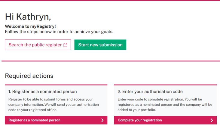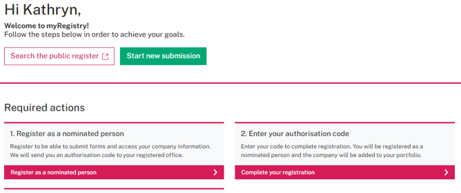 Log on to myRegistry and follow the below steps to register as a nominated person. Once you have registered to be a nominated person your application will be processed and a 6 digit PIN will be issued to the company's registered office address by post. PIN letters should be received within three working days of your application.