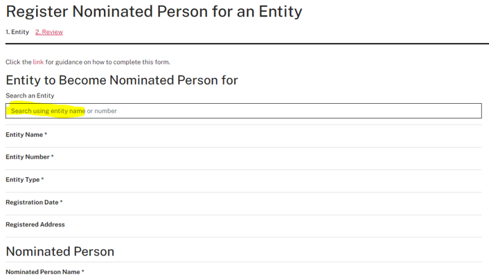 Step 2 – Search for your entity using the highlighted search bar below and enter you details as the nominated person.