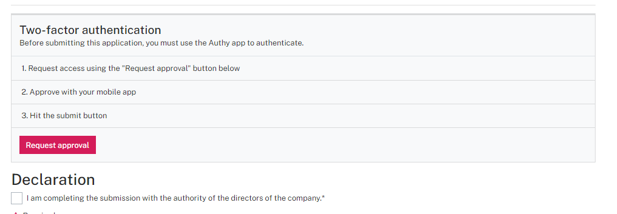 Once you have completed and submitted this form, the Registry team will review your application and generate an authorisation code that will be mailed to the registered office of your entity. - On receipt of the authorisation code, the nominated person is required to log on and complete the registration process.